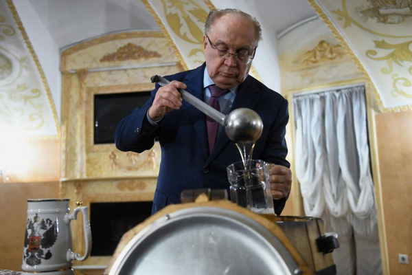 Ректор Виктор Садовничий лично разливает медовуху, приготовленную по монастырскому рецепту; мероприятие проходит в Фундаментальной библиотеке МГУ