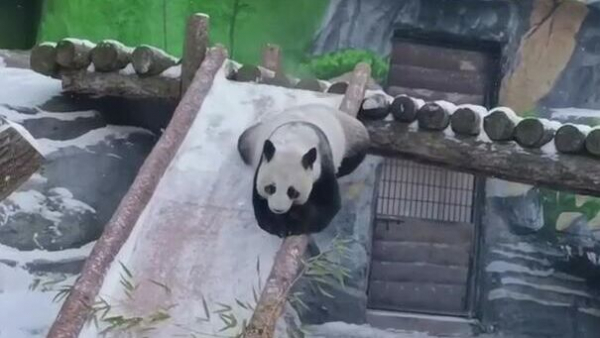 На видео, опубликованном в Telegram-канале, мама-панда с детским восторгом играет в снегу, съезжает с горки и бегает с мячиком, рассекая снежный покров.